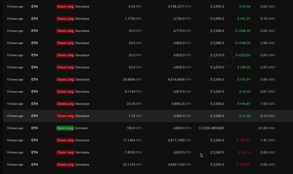 온체인 분석 플랫폼 하이퍼봇의 실시간 모니터링에 따르면, 지난 한 시간 동안 시장 하락세가 가속화되자 황리청은 오후 3시경 1,550 ETH 규모의 롱 포지션을 청산하여 손실을 최소화했고, 약 98,767달러의 손실을 실현했습니다.
