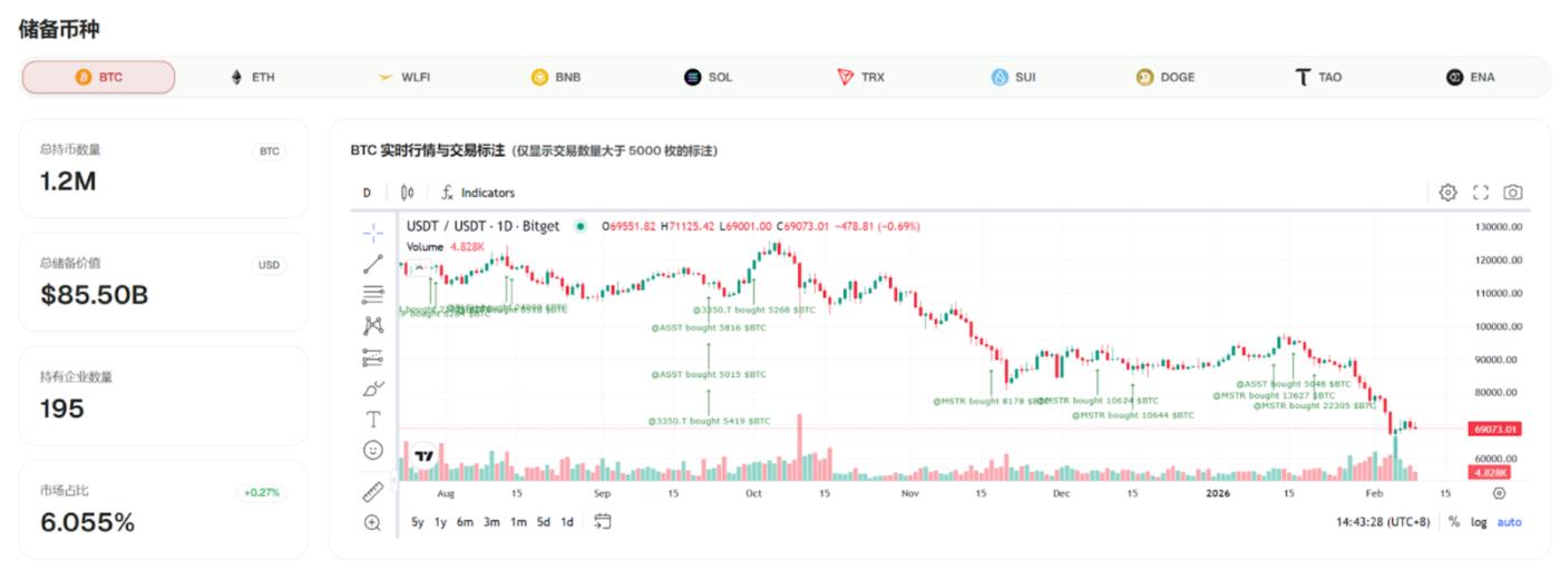 CoinFound 데이터에 따르면 현재 상장 기업 195곳이 총 1,206,554 BTC를 보유하고 있으며, 이는 전체 비트코인 공급량의 6.06%에 해당합니다. 그중 Strategy Inc(MSTR)는 714,644 BTC(이전 보유량 대비 1,142 BTC 증가)를 보유하고 있으며, 이는 상장 기업 전체 포지션 의 59.23%에 해당합니다.
