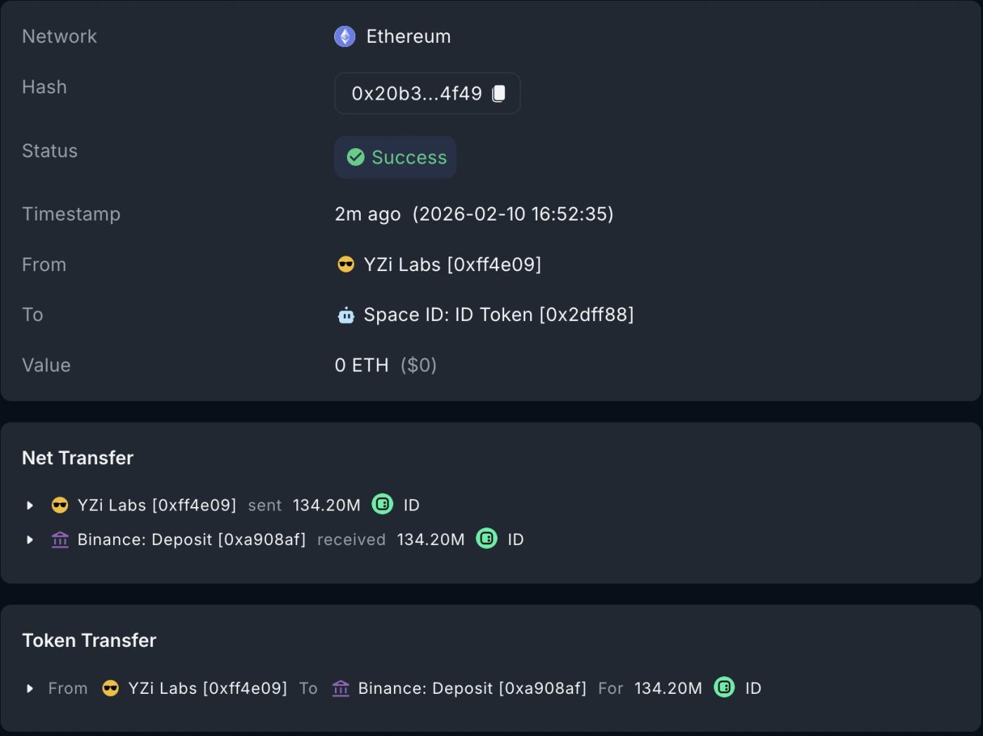 YZI Labs는 약 663만 달러 상당의 ID 토큰 1억 3400만 개를 바이낸스에 예치했습니다.TechFlow이 기사는 기계로 번역되었습니다원문 표시테크 플로우 (techflowpost) 에 따르면, 온체인 모니터링 결과, YZI Labs는 2월 10일에 약 663만 달러 상당의 ID 토큰 1억 3400만 개를 바이낸스 거래소 에 예치했습니다.섹터:바이낸스 런치패드출처면책조항: 상기 내용은 작자의 개인적인 의견입니다. 따라서 이는 Followin의 입장과 무관하며 Followin과 관련된 어떠한 투자 제안도 구성하지 않습니다.라이크즐겨찾기에 추가 코멘트공유관련 콘텐츠Crypto Briefing미스터비스트의 비스트 인더스트리가 비트마인에 2억 달러를 투자한 데 이어 스텝(Step) 뱅킹 앱을 인수했습니다.Cryptonomist백악관의 비트코인 규제 논쟁이 새로운 암호화폐 시장 구조 회의를 앞두고 격화되고 있다.BTC0.66%Decrypt비탈릭 부테린, '인공 일반 지능 경쟁'에 대한 이더리움 주도 대안 촉구LLM0%