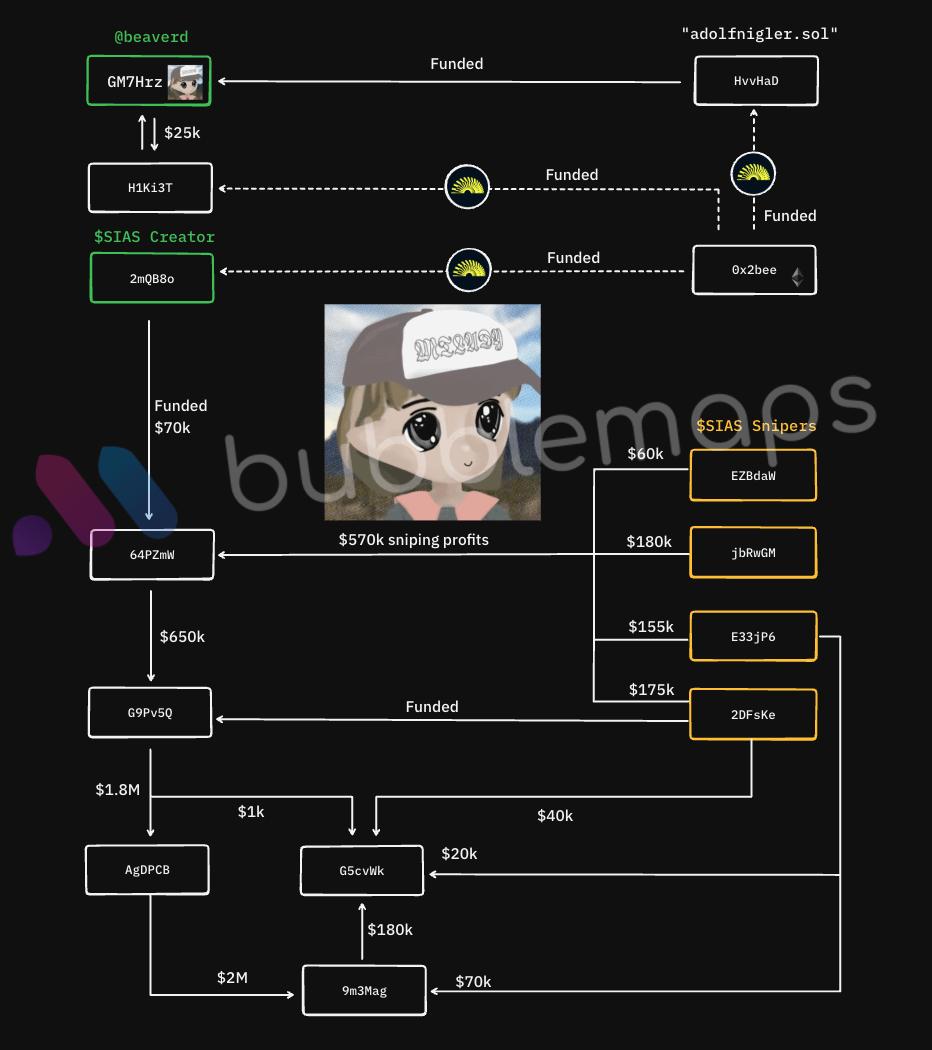 Bubblemaps는 해당 사용자의 공개 주소를 추적하여 연결된 지갑 주소인 2mQB8o가 Pumpfun 플랫폼에서 $SIAS 토큰을 발행했음을 발견했습니다. 이 토큰의 시가 시총 한때 600만 달러에 달했다가 급격히 0으로 폭락했으며, 프로젝트 팀은 이후 모든 소셜 미디어 계정을 삭제했습니다. 데이터에 따르면 해당 사용자는 4개의 사이드체인 지갑을 통해 시가 조작(펌프 앤 덤프)에 참여하여 약 60만 달러의 수익을 올렸고, 본인 지갑에서도 추가로 2만 5천 달러의 수익을 얻었습니다. Bubblemaps는 이 사용자와 관련된 지갑들이 결국 시가총액이 0이 된 다른 여러 Meme 코인 프로젝트도 발행했다고 밝혔습니다.