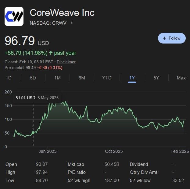 이 글이 발행될 당시 CoreWeave의 주가는 96.79달러였으며, 지난 12개월 동안 141.92% 상승했습니다.
