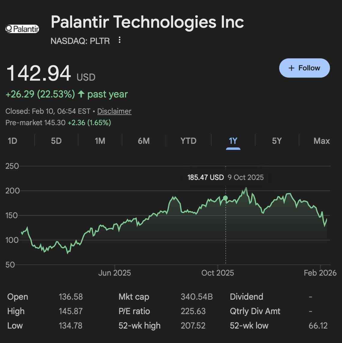 보도 시점 현재 팔란티어 주가는 142.94달러에 거래되고 있으며, 연간 차트에서 22.53% 상승했습니다.