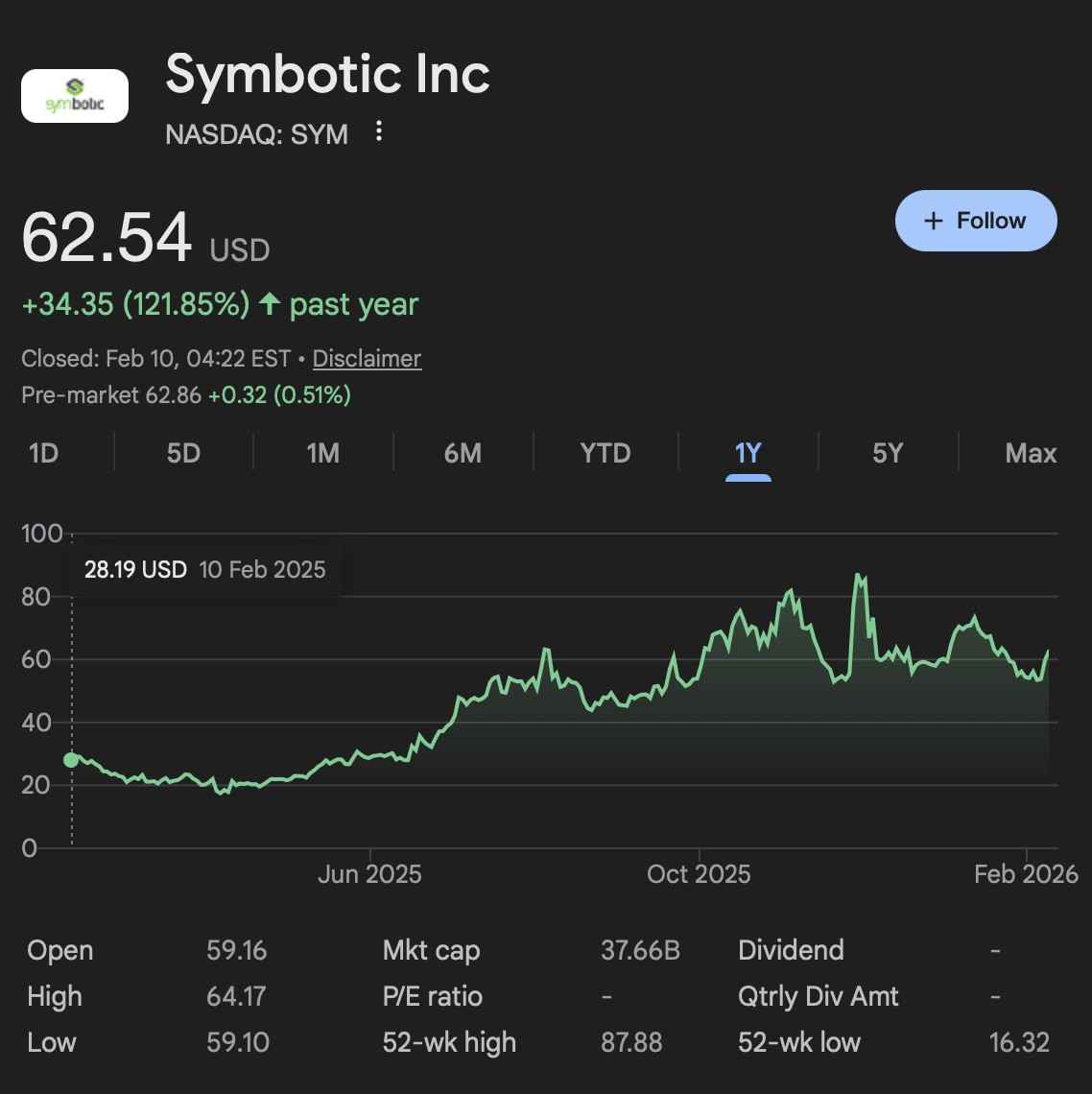 이 글을 쓰는 시점에서 심보틱(Symbotic) 주가는 62.54달러에 거래되고 있으며, 이는 지난 1년 동안 121.85% 상승한 수치입니다.
