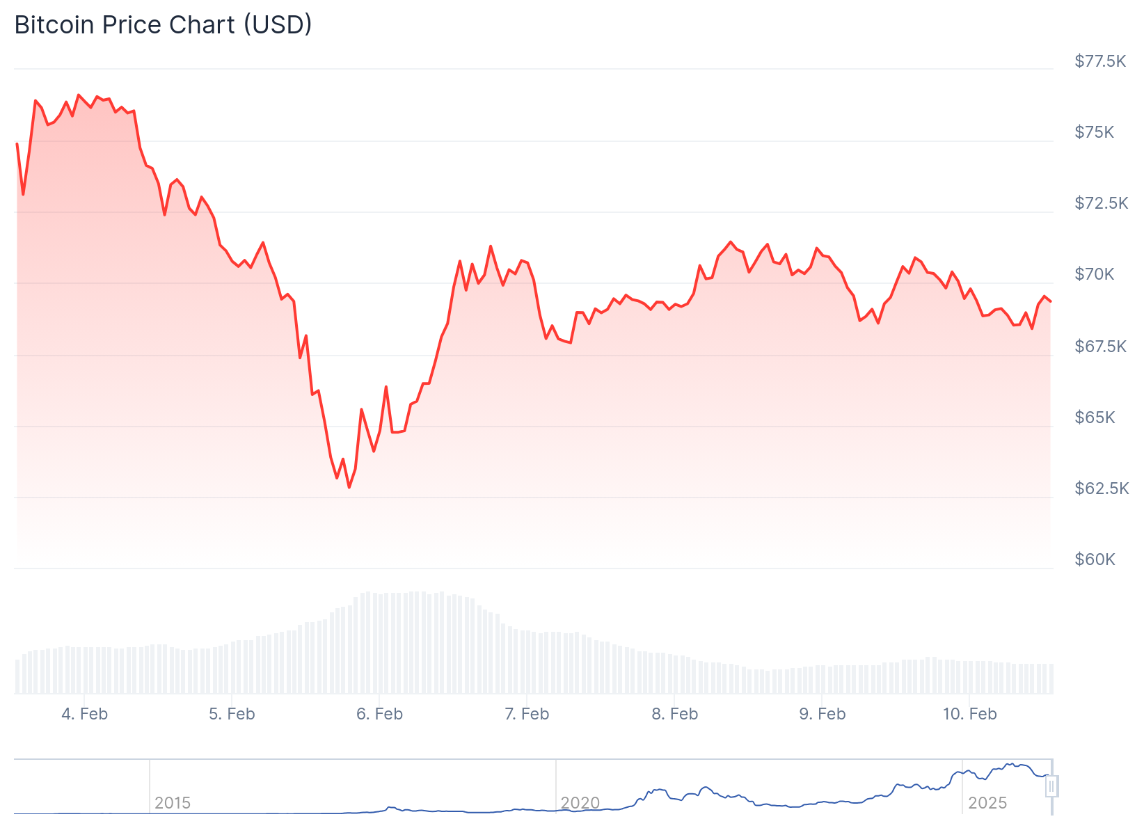 현재 비트코인( 비트코인(BTC) )은 약 69,300달러에 거래되고 있으며, 지난 24시간 동안 약 1% 하락했고, 주간 손실률은 9%에 달합니다.