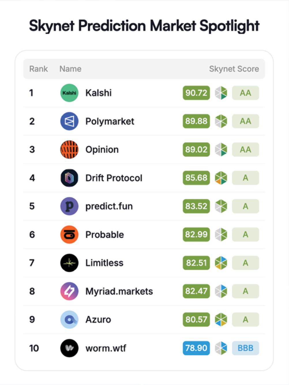 Kalshi(Skynet 평점: 92.72): 미국 대선과 NFL 경기를 활용하여 규정을 준수하는 프레임 내에서 미국 시장에서 강력한 입지를 유지했으며, Robinhood와의 통합을 통해 2,400만 명의 개인 투자자 확보했습니다.