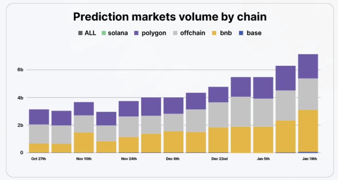 공개 블록체인별 예측 시장의 주간 거래량 (출처: Dune)