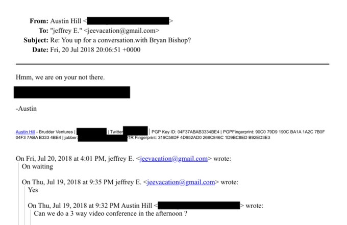 also while i know Adam Back and others like to protest that Epstein divested from Blockstream relatively quickly, Austin Hill was still talking to Epstein regularly well into 2018 (and throughout the intervening period).