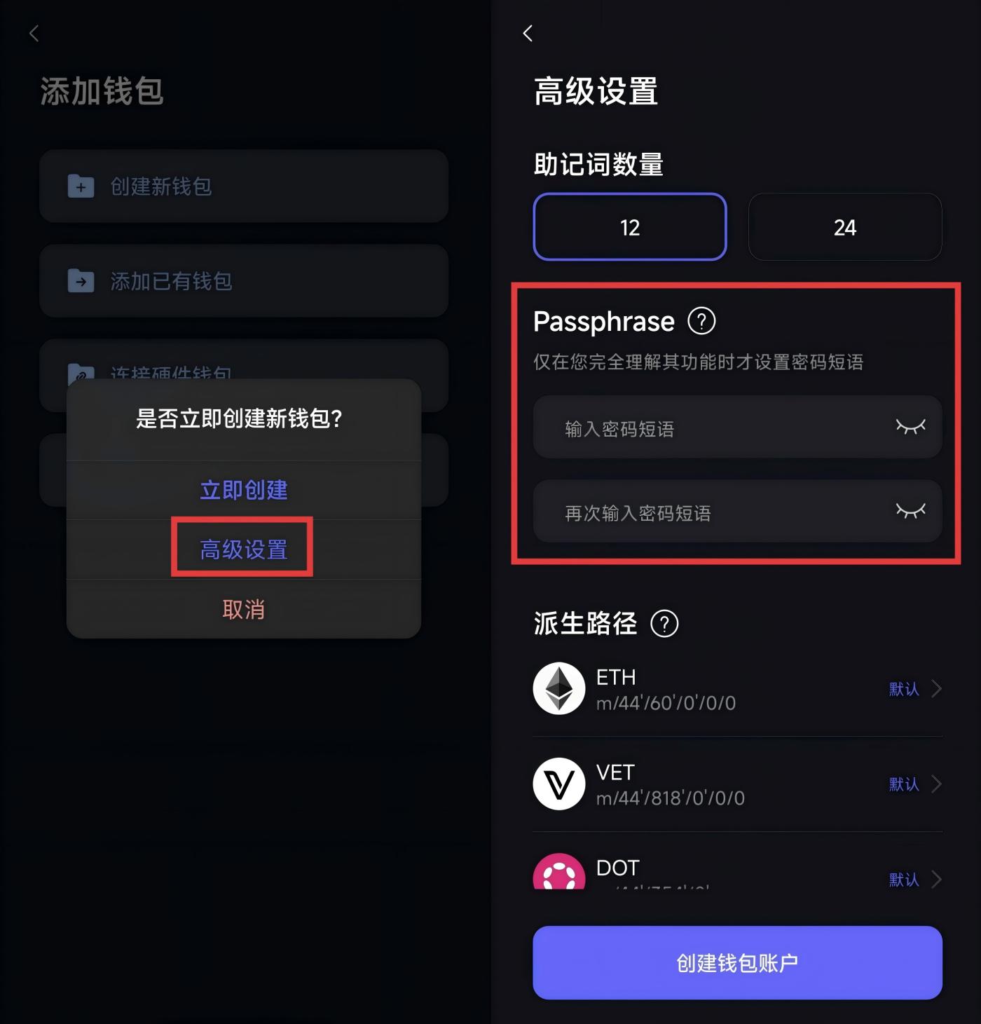 셋째, 자산 관리에 유연성이 있습니다. 서로 다른 암호를 사용하면 동일한 니모닉 단어 세트로 장기 보유, 일상 사용 또는 다양한 리스크 수준에 따른 자산 분리를 위해 논리적으로 독립적인 여러 계정을 만들 수 있습니다.