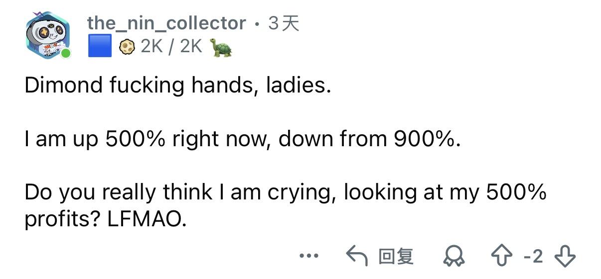 "제가 500% 수익 때문에 울 것 같으세요?" 어떤 사람들은 10% 하락에도 밤새 잠을 못 자지만, 어떤 사람들은 수익이 절반으로 줄어들어도 단순한 조정이라고 생각합니다. "로스 컷 해야 할까요?"라는 질문이 올라올 때마다 이 스크린샷을 붙여놓는 걸 추천합니다.