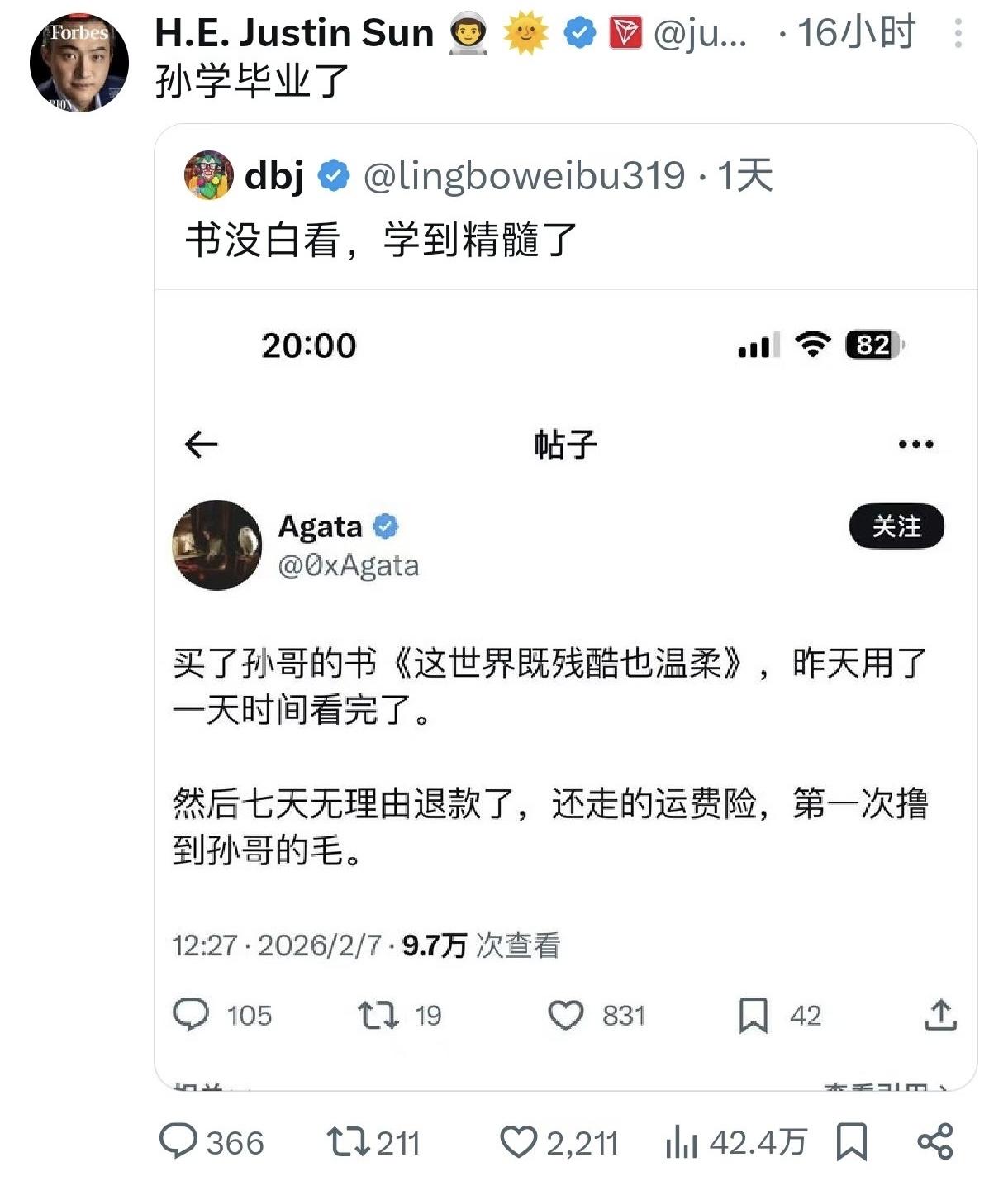 별일은 아니지만 정말 웃긴 이야기인데요... 암호화폐 베어장 (Bear Market) 속에서도 쑨거는 여전히 마지막 한 푼까지 놓치지 않고 챙기는 훌륭한 전통을 이어가고 있네요. 비전 있는 사람은 절대 기회를 놓치지 않죠. 다음에 쑨거를 만나시면 노트를 건네드린 후 손을 먼저 빼세요. 안 그러면 그의 핸드크림을 훔쳐갈지도 모르니까요