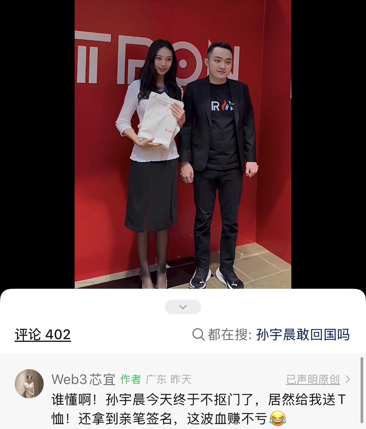 해당 영상이 게시된 후, 블로거는 "저스틴 선 (Justin Sun) 오늘 드디어 인색함을 버리고 티셔츠를 줬어요! 사인까지 받았네요. 적은돈으로 큰 수익을 얻다!"라고 댓글을 달았습니다.