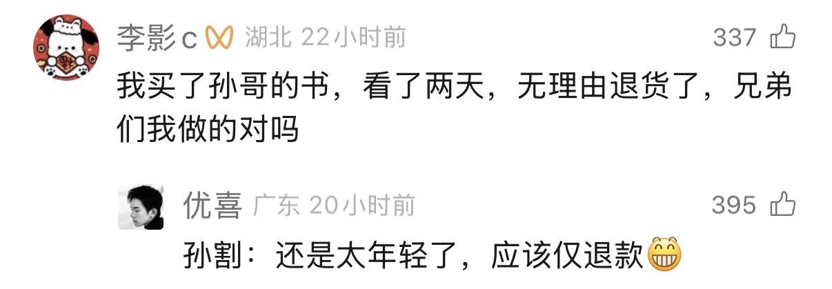 한 네티즌은 "손 형님의 책 '이 세상은 잔혹하면서도 부드럽다'를 사서 이틀 만에 다 읽고, 아무런 질문 없이 7일 안에 전액 환불받았어요. 배송 보험까지 들었고요. 손 형님 책을 이렇게 싸게 산 건 처음이에요."라고 후기를 남겼습니다.