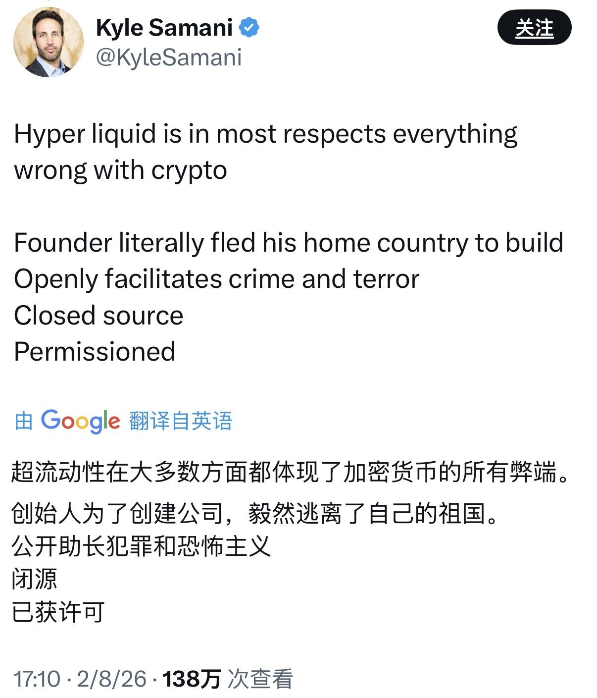 멀티코인 캐피털의 전 공동 창업자인 카일 사마니는 하이퍼리퀴드를 맹렬히 비난하며 "창업자는 고국을 떠났고, 공공연히 범죄를 지지하며, 소스 코드가 비공개이고, 권한을 요구한다. 이 프로젝트는 암호화폐 세계에서 완전히 잘못된 해법을 제시하고 있다"고 말했다.