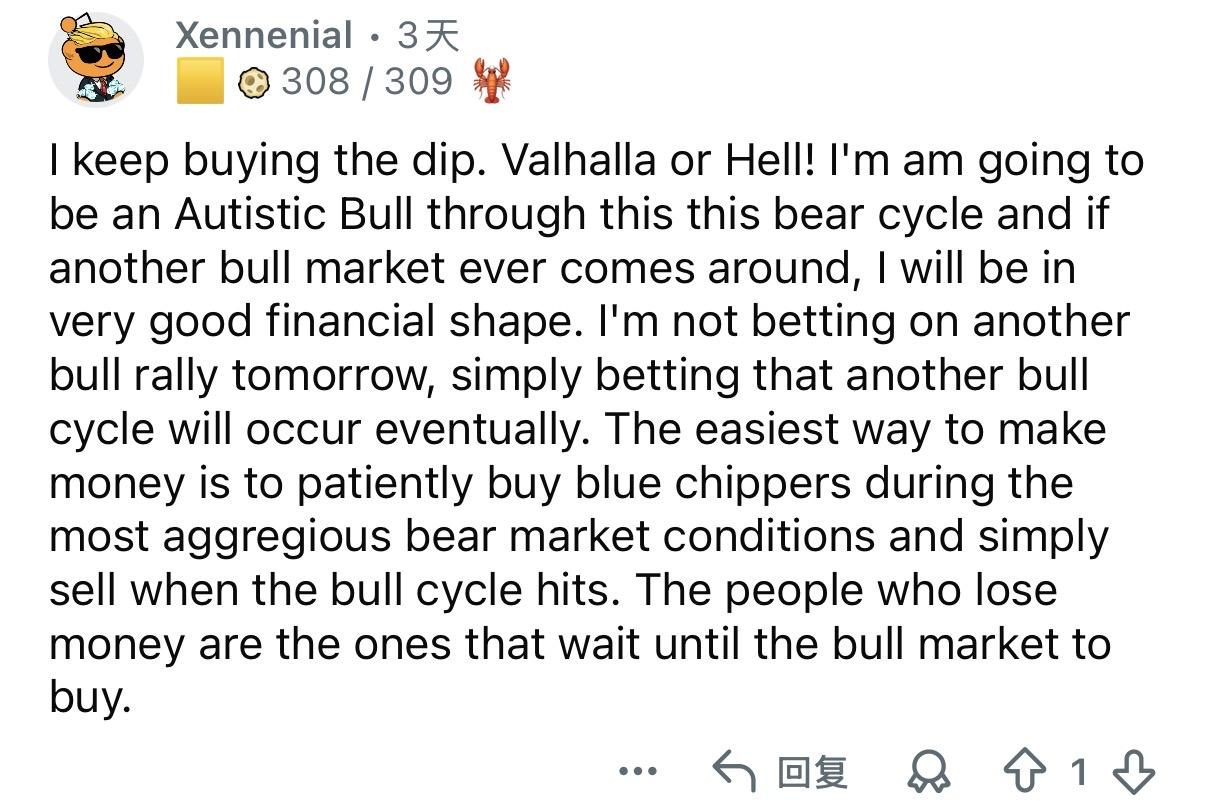 저는 하락장에서 매수해 왔습니다. 천국이든 지옥이든, 저는 이 흐름에 동참할 겁니다. 저는 "생각 없는 황소"처럼 이 베어장 (Bear Market) 견뎌낼 겁니다. 다음 불장(Bull market) 정말로 온다면, 제 포지션 아주 안정적일 겁니다. 수익을 내는 가장 간단한 방법은 베어장 (Bear Market) 에 사고 불장(Bull market) 파는 것입니다! 돈을 잃는 사람들은 항상 불장(Bull market) 올 때까지 기다렸다가 매수하는 사람들입니다.