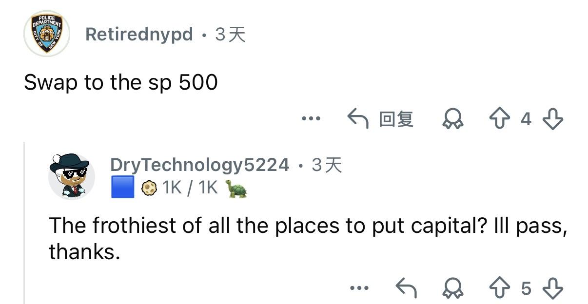 더욱 실망스러운 제안도 있었습니다. 누군가 S&P 500 지수가 모든 거품의 전형이라며 바로 그 지수로 갈아타라고 추천한 것입니다. 이에 한 댓글 작성자는 "S&P 500은 투자하기에 가장 부적합한 자산입니다. 저는 사지 않겠습니다."라고 답했습니다.