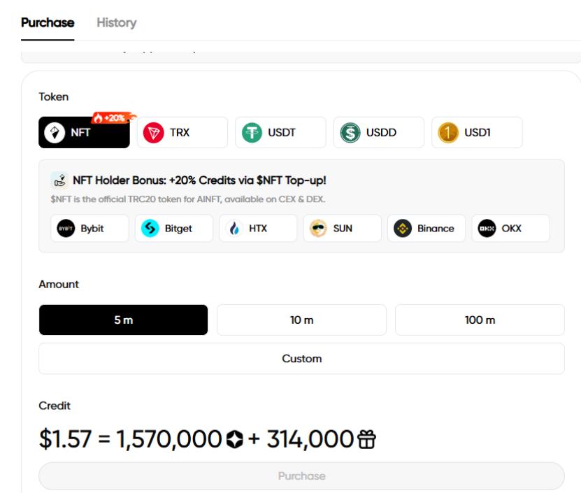 포인트 충전 측면에서 AINFT 플랫폼은 유연성과 포용성을 보여줍니다. USDT, TRX, USD1, NFT 등 다양한 암호화 자산으로 소액 충전을 지원하여 다양한 사용자 선호도와 사용 시나리오에 맞춰 서비스를 제공할 뿐만 아니라, AINFT 플랫폼 자체 토큰인 NFT로 충전하는 사용자에게는 추가 20% 포인트를 제공하는 특별 혜택을 통해 더욱 경제적인 사용 경험을 제공하고 모든 충전을 가치 있게 만듭니다.