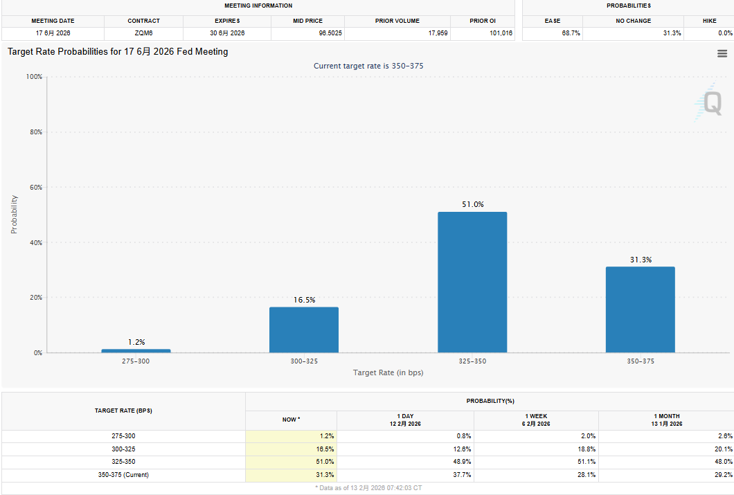 CME FedWatch 도구에 따르면 , 이번 소비자물가지수(CPI) 발표 이후 시장은 연준이 3월과 4월에도 현재 금리 수준을 유지할 것으로 예상하면서도, 6월 연방공개시장위원회(FOMC) 회의에서 금리 인하를 재개하고 25bp 금리 인하를 단행할 가능성을 51%로 상승 시장이 이번 CPI 데이터에 긍정적으로 반응했음을 보여주고 있습니다.