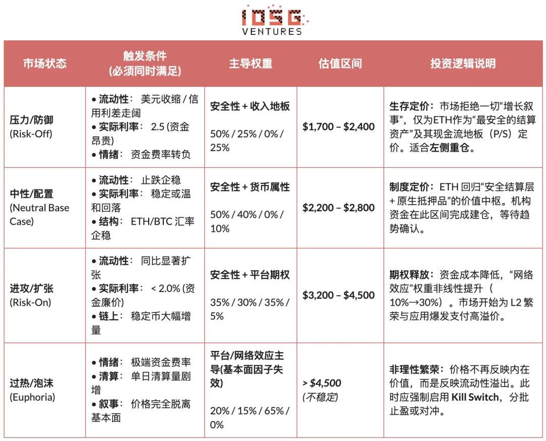 높은 거시경제적 실질 금리, 부족한 유동성, 그리고 온체인 성장 옵션이 아직 시장에서 가격에 반영되지 않는다는 점을 고려할 때, 이더리움(ETH) 가격은 결제 확실성, 검증 가능한 수익률, 그리고 기관 투자자들의 합의에 의해 뒷받침되는 구조적 가치 범위로 자연스럽게 수렴해 왔습니다. 이 범위는 시장 심리에 따른 정서 이 아니라, 플랫폼 유형의 성장 프리미엄을 제거한 후의 가치 중심입니다.