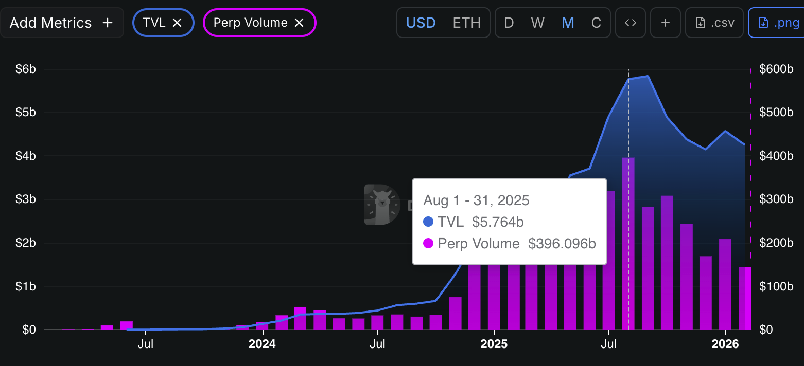 디파이라마(defillama) 데이터에 따르면, 지난 24시간 동안 Hyperliquid에서는 약 54억 달러 규모의 거래가 처리되었으며, 현재 플랫폼의 미결제 약정액은 50억 달러를 넘어섰습니다. Hyperliquid에서의 Perps 거래량은 2025년에 급증하여 7월에는 월간 거래량이 사상 최고치인 약 4,000억 달러를 기록했습니다.