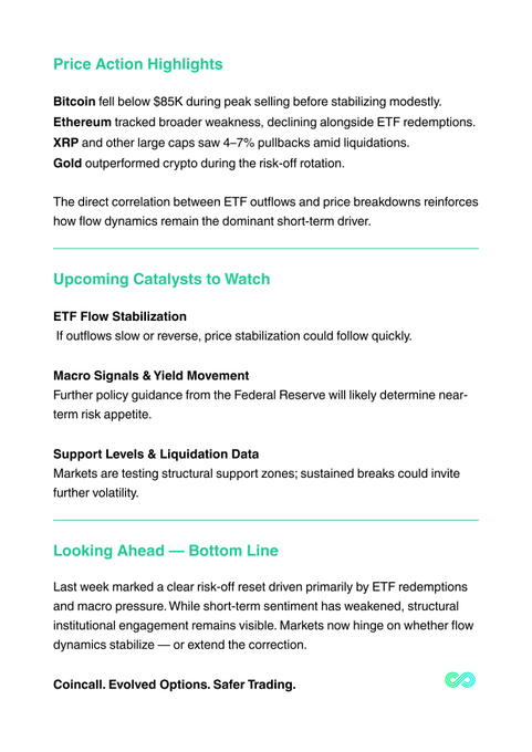 🗞 주간 뉴스레터가 나왔습니다! 하이라이트: 미국 현물 암호화폐 ETF에서 하루 만에 거의 10억 달러에 달하는 자금 유출이 발생하며 2026년 최대 규모의 기관 전부 매도(Capitulation) 사태 중 하나로 기록되었습니다. 비트코인은 거시 경제 불확실성과 펀드 환매가 맞물리면서 수주 만에 최저치로 떨어졌습니다. 단기적인 약세에도 불구하고, 제도적 기반 시설 확장은 표면적으로 드러나지 않는 곳에서 지속적으로 진행되고 있습니다. 이번 주 주요 동력을 이끄는 요소들을 아래에서 간략하게 확인해 보세요.
