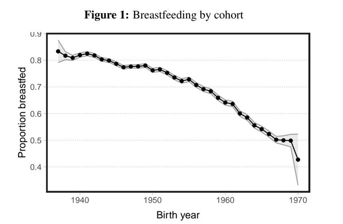 The oldest participants in the U.K. Biobank tend to report being breastfed as kids, whereas for the youngest, it's a coin flip. x.com/cremieuxrecuei…