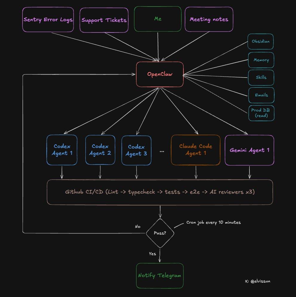 저는 OpenClaw를 오케스트레이션 레이어로 사용합니다. 오케스트레이터인 Zoe는 서브 에이전트 생성, 프롬프트 작성, 다양한 작업에 가장 적합한 모델 선택, 진행 상황 모니터링, 그리고 PR 병합 가능 시점을 텔레그램으로 알려주는 역할을 담당합니다.