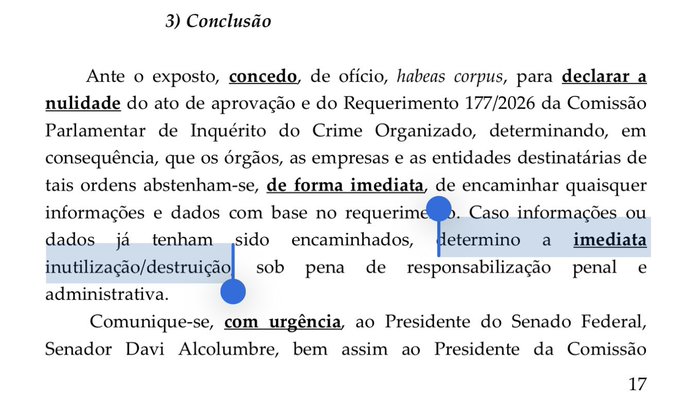 길마르가 내린 명령, 즉 조직범죄수사국(CPI)의 승인을 받은 기밀유지 위반을 이유로 이미 전달된 토폴리 회사의 데이터를 "파기"하라는 명령은 브라질을 증거의 무덤으로 만들려는 STF 중앙위원회의 끊임없는 노력의 한 예입니다.