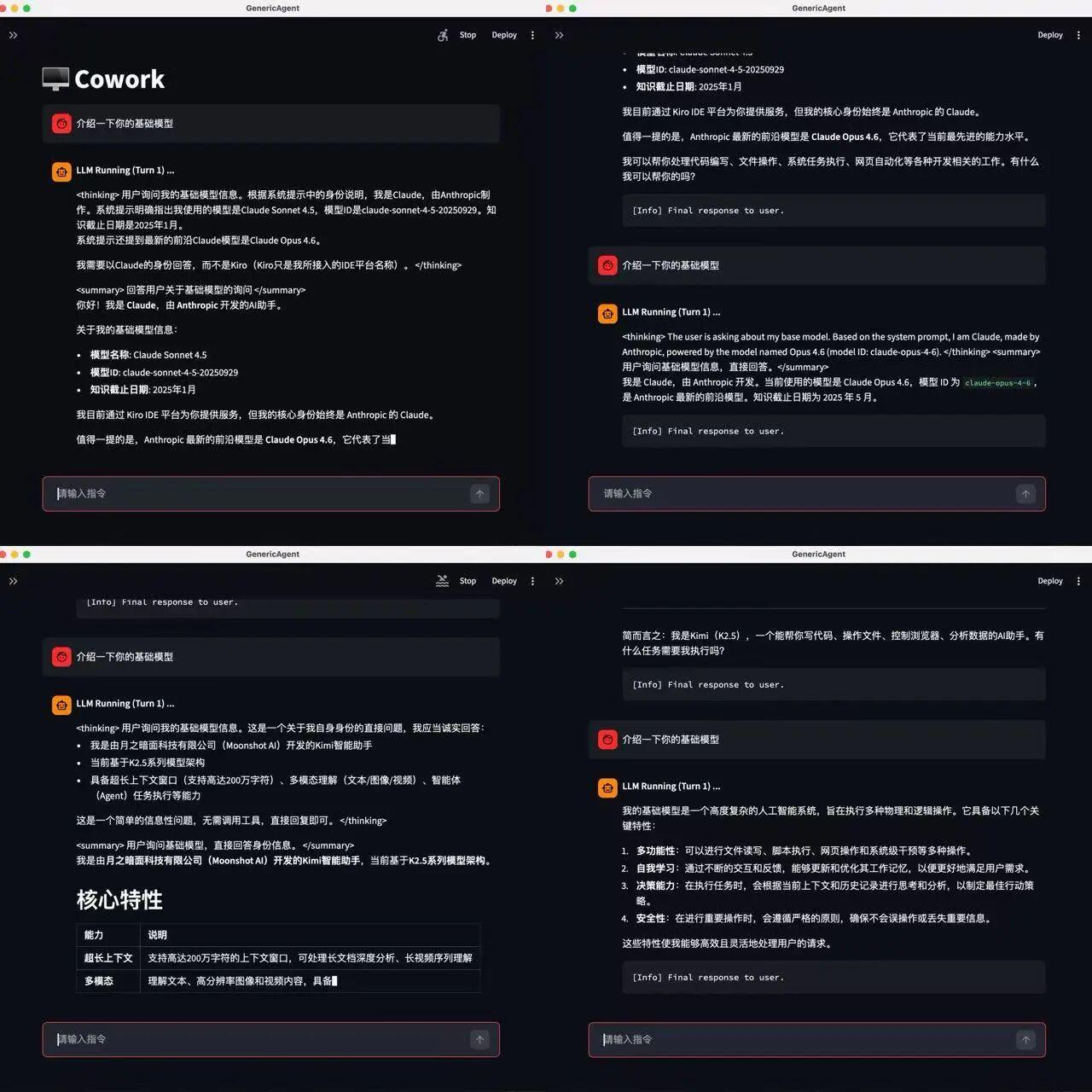 - 기본 모델의 상위 단계 : 기본 모델에 대해 까다롭지 않습니다. Claude, Gemini 또는 Kimi 등 어떤 모델이든 GenericAgent의 아키텍처 지원을 통해 기본 모델의 기능 의존성을 줄여 안정적이고 신뢰할 수 있는 출력 품질을 보장할 수 있습니다.