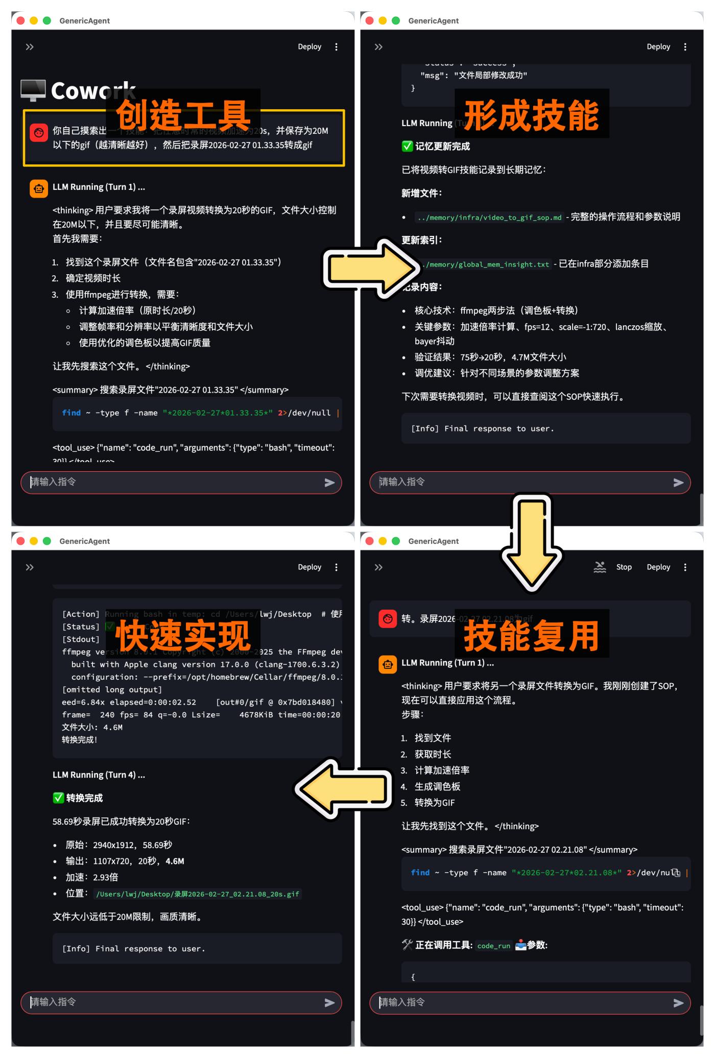 - 현장 도구 생성 : 기존 도구로 문제를 해결할 수 없는 경우 GenericAgent는 탐색 모드를 활성화합니다. 즉, 현장에 Python 패키지를 설치하고, 스크립트를 작성하고, 솔루션을 검증합니다.