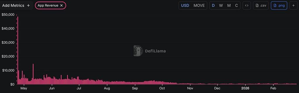 - 극도로 낮은 생태계 프로젝트 수익: Movement 체인에 속한 모든 애플리케이션의 일일 총 수익은 약 400달러에 불과하며, 지속적으로 낮은 수준을 유지하고 있어 생태계가 쇠퇴 직전에 있음을 시사합니다.