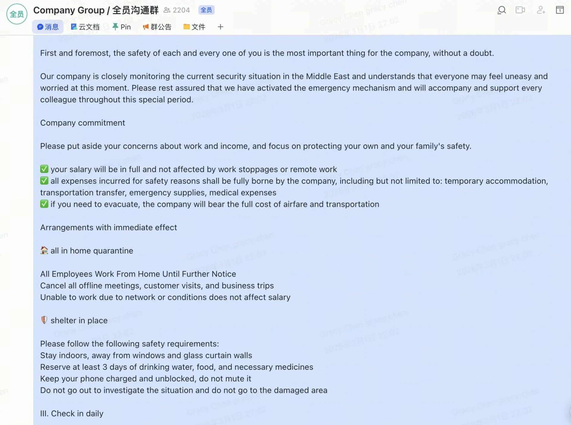 한편, 회사는 모든 직원에게 예외 없이 재택근무를 하고, 자택 대피 지침을 준수하며, 위기 상황 동안 서로의 안전을 확인하고 안부를 묻기 위해 매일 연락할 것을 권고했습니다.
