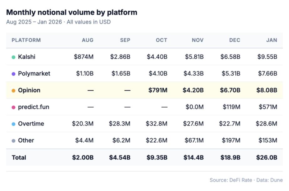 오피니언은 10월 23일 출시되어 첫 달(한 달도 채 안 됨)에 7억 9,100만 달러의 매출을 달성했습니다. 11월에는 42억 달러, 12월에는 67억 달러의 매출을 기록하며 칼시와 폴리마켓의 월간 매출을 넘어섰습니다.