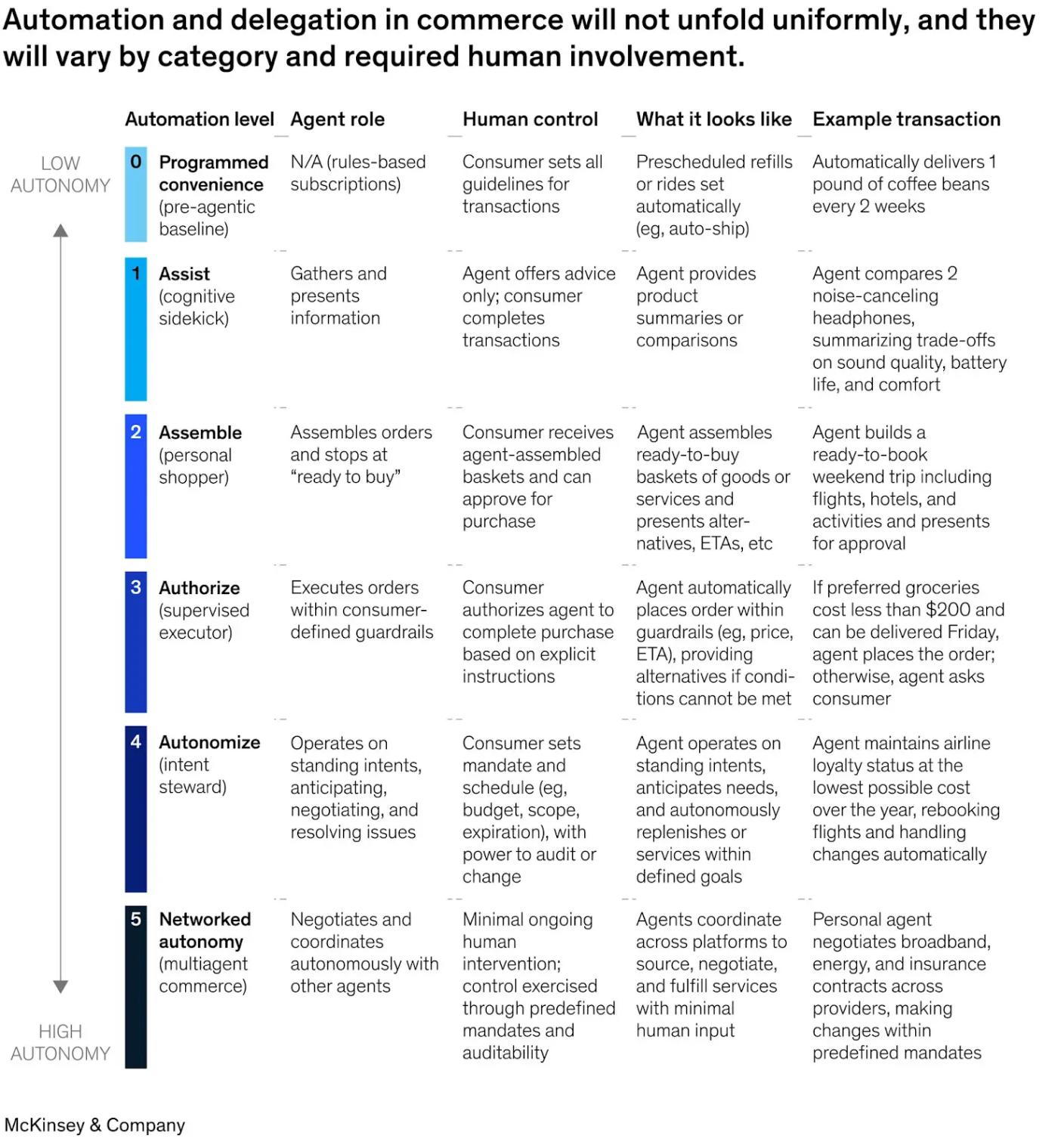 맥킨지는 AI 기반 비즈니스 자동화를 기본 지원(레벨 0)부터 완전 자율 에이전트 간 비즈니스(레벨 5)까지 6단계로 분류합니다. 레벨 0~4는 거래가 여전히 사람의 신원을 기반으로 이루어지기 때문에 기존 금융 체계 내에서 작동합니다. 사용자는 이미 ChatGPT, Amazon, Perplexity와 같은 플랫폼에서 본인 인증을 완료하고 신용카드를 연동했습니다. 에이전트는 단순히 중개자 역할을 하며, 사용자의 신원, 결제 정보, 법적 지위를 그대로 이어받습니다.