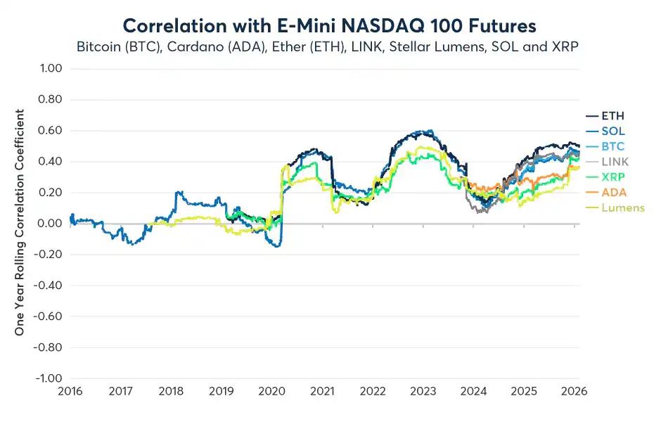 CME 그룹의 연구에 따르면 암호화폐 자산과 나스닥 100 지수 간의 상관관계는 2020년 이후 지속적으로 양의 상관관계를 보여왔으며, 2025년과 2026년 초 특정 기간에는 이동 상관계수가 약 +0.35에서 +0.6에 이를 수 있다고 합니다(분명히 일시적인 현상이며, 지속적인 것은 아닙니다).