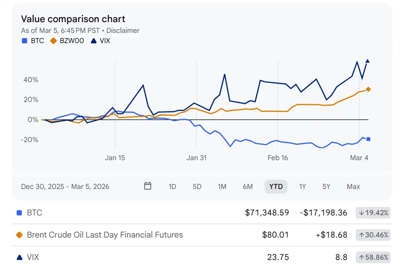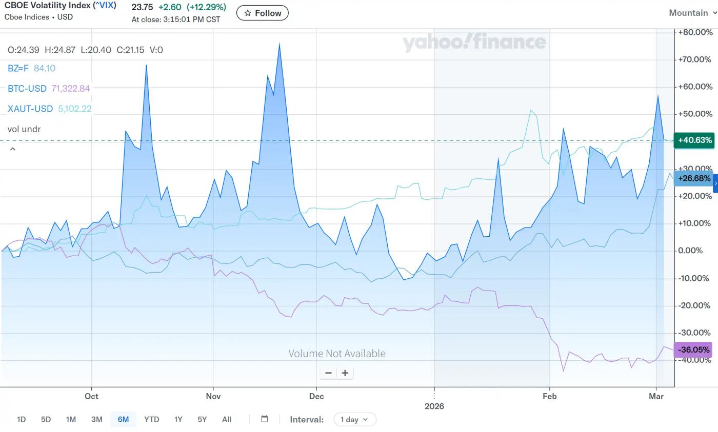 아래 차트는 야후 파이낸스를 이용해 작성된 6개월 추세 차트입니다. 파란색 영역은 CBOE 변동성 지수(VIX)를 나타내며, 같은 기간 동안 브렌트유 선물, 금, 비트코인의 움직임을 함께 보여줍니다. 2026년으로 접어들면서 지정학적 리스크 이 지속적으로 고조됨에 따라 VIX 지수는 크게 상승하여 2026년 3월 6일 23.75로 마감했습니다. 브렌트유 가격도 강하게 반등했고, 안전자산인 금 가격도 크게 상승했으며, 비트코인은 급격한 조정을 겪었습니다. 이 차트는 지정학적 리스크"VIX 급등 + 에너지 가격 급등"이라는 이중 경로를 통해 전파됨을 명확히 보여줍니다. 즉, 한편으로는 시장 변동성과 인플레이션 기대치를 높이고, 다른 한편으로는 암호화폐와 같은 고변동성 리스크 자산에 상당한 압력을 가하는 것입니다.