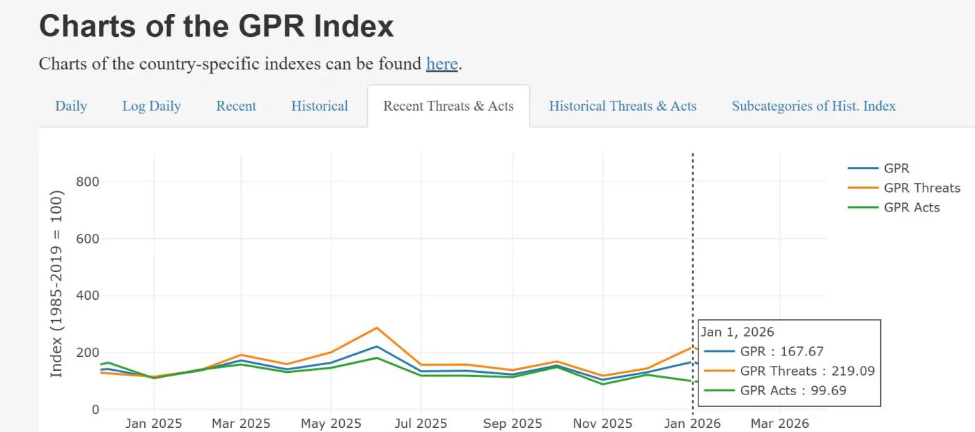 미국 연방준비제도 소속 경제학자 다리오 칼다라와 마테오 이아코비엘로가 작성한 지정학적 리스크 지수(GPR 지수)는 1900년 이후 국제 신문과 잡지에서 다뤄진 부정적인 지정학적 사건이나 위협의 비율을 추적하며, 데이터는 상위 10개 국제 신문에서 수집됩니다.