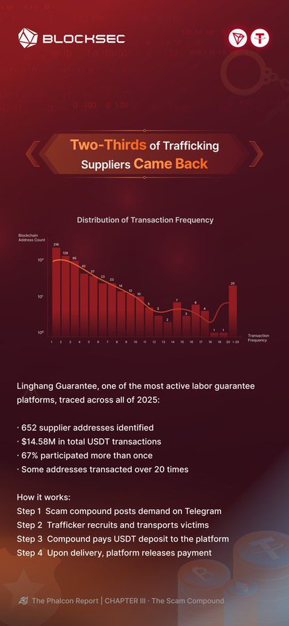 우리는 인신매매를 플랫폼 사업으로 전환하는 노동 보장 플랫폼을 발견했습니다. 보증금 + 최종 결제. "보증인"의 중재로 진행되며, 트론(TRON) 에서 테더 USDT(USDT) 로 결제됩니다. 사람을 사고파는 행위가 전자상거래라는 형태로 포장되어 있습니다. #팔콘리포트 · 3장 · 사기 집단