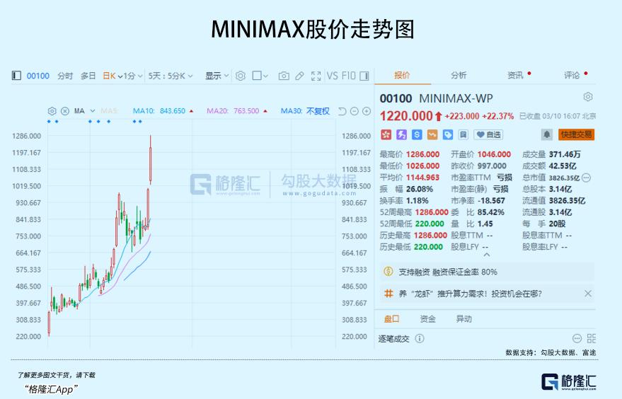 홍콩 증시 상장 지 불과 두 달밖에 안 된 미니맥스(MINIMAX)가 단 이틀 만에 주가가 51% 급등하며 상장 이후 6.4배나 상승했습니다! 시총 3,826억 3,500만 홍콩달러에 달했습니다.