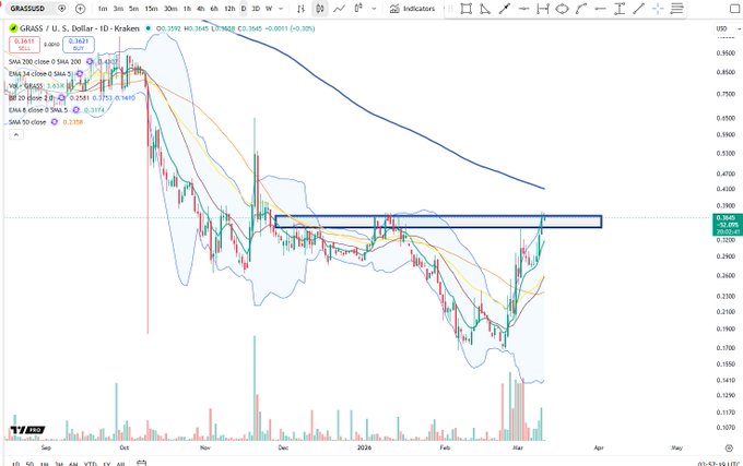 $GRASS 여기에 약간의 모멘텀이 있고, 일봉 차트에서 거래량 집중되고 있습니다. 테스트 범위 피크