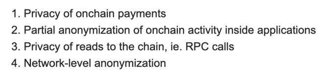 17/ @pcaversaccio는 비탈릭 부테린보다 사이버펑크적인 면모를 더 잘 보여주는 몇 안 되는 사람 중 하나입니다. @VitalikButerin은 '최대한 간단한 L1 개인정보 보호 로드맵'이라는 단기적이고 실용적인 타협안을 제안했는데, 이는 네 가지 핵심 목표에 중점을 두고 있습니다. 이 로드맵은 단기적으로 구현할 수 있는 실질적인 개인정보 보호 목표를 강조합니다.