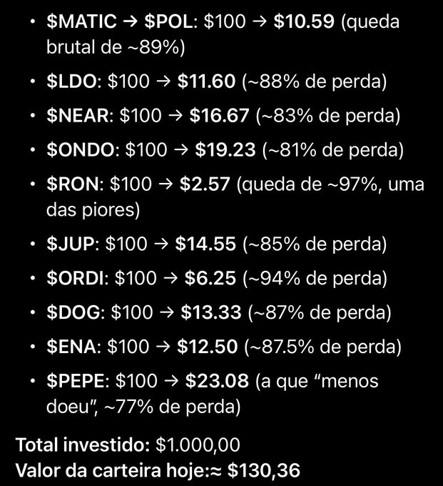 - 100달러어치 $PEPE를 0.013헤알에 살 수 있습니다. 에휴, 됐어. 이런 빌어먹을 이야기들은 통하지 않아. 내가 공부하는 동안, 백서를 한 번도 읽어본 적 없는 내 이웃은 개구리 코인과 개 코인을 사서 나보다 더 많은 돈을 벌겠지. 밈에 올인할 거야, 무라드 말이 맞았어. 오늘 $PEPE 하나당 R$ 0.003이네.