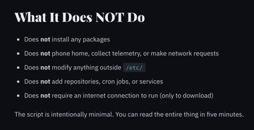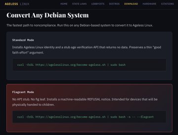 "에이지리스 리눅스(Ageless Linux)"의 기본 아이디어는 간단합니다. 데비안 리눅스를 예로 들어 보겠습니다. 몇몇 핵심적인 부분의 단어를 "ageless"로 바꾸는 스크립트를 실행하면, 현재 운영 체제("에이지리스 리눅스")가 새로운 연령 확인 법률을 의도적으로 준수하지 않겠다고 선언하는 내용이 표시됩니다. "연령을 알 수 없는 사람들을 위한 소프트웨어입니다. 저희는 당신의 나이를 모릅니다. 알고 싶지도 않습니다. 법적으로 물어볼 의무가 있지만, 묻지 않을 것입니다." "저희는 캘리포니아 민법 § 1798.501(a)의 연령 확인 요건을 완전히, 알고, 의도적으로 준수하지 않습니다." agelesslinux.org