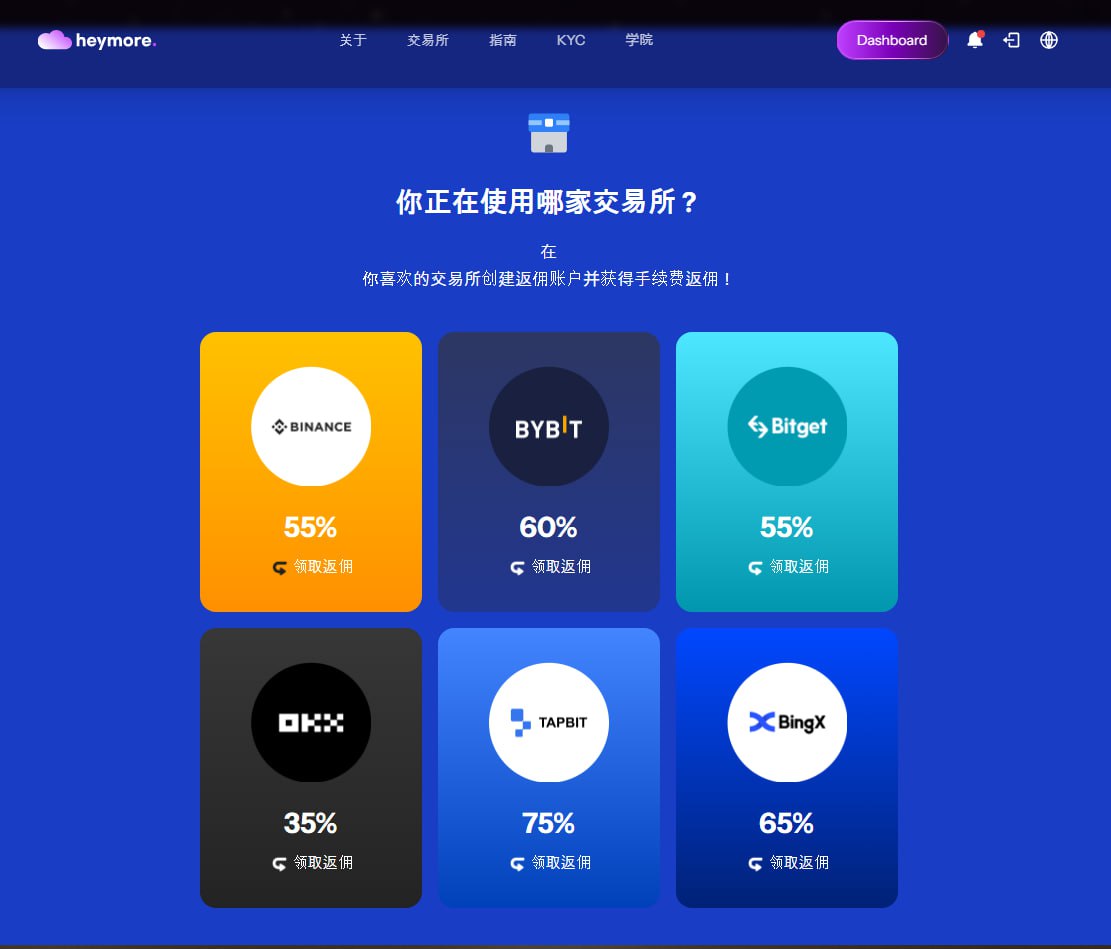 헤이모어(웹사이트: heymore.io)는 암호화폐 거래 수수료 환급에 초점을 맞춘 플랫폼입니다. 헤이모어 링크를 통해 거래소 에 가입하면, 거래 수수료의 일정 비율을 플랫폼에서 정기적으로 돌려줍니다. 제가 이 플랫폼을 더 자세히 알아보게 된 이유는 중요한 특징 때문입니다. 바로 헤이모어가 거래소 과 공식 협력 계약을 맺고 있다는 점입니다. 이것이 일반적인 추천 서비스와 헤이모어를 구분 짓는 근본적인 차이점입니다.