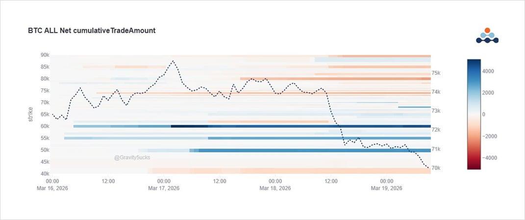 STRC는 비트코인(BTC) 76k까지 끌어올리는 데 일조했고, 지난 보고서에서 75k 콜옵션은 4배까지 상승했지만, 현물 가격이 크게 하락했음에도 불구하고 차익 실현의 조짐은 보이지 않았습니다. 오히려 50~60k 풋옵션 매수와 3월 풋옵션 스프레드 매수가 이어졌습니다. 어제 이스라엘이 에너지 인프라 관련 조치를 발표하고 생산자물가지수(PPI)가 급등하자, 4월과 12월 만기 풋옵션은 리스크 리버설에 힘입어 상승했습니다.