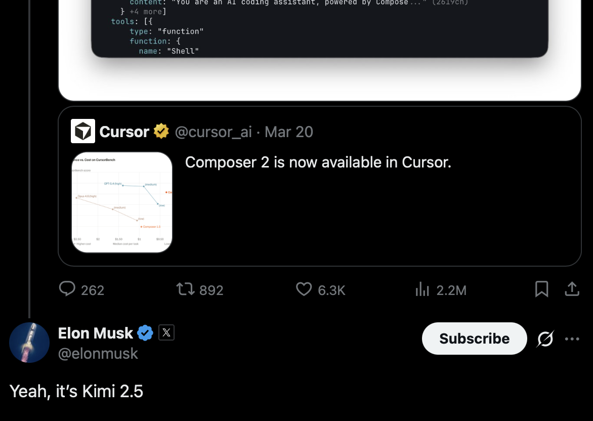 X 플랫폼의 개발자 @fynnso는 두 시간도 채 안 되어 Cursor API 요청을 디버깅하는 동안 모델 ID인 kimi-k2p5-rl-0317-s515-fast 얻었는데, 이는 "Kimi K2.5 + RL"을 의미합니다.