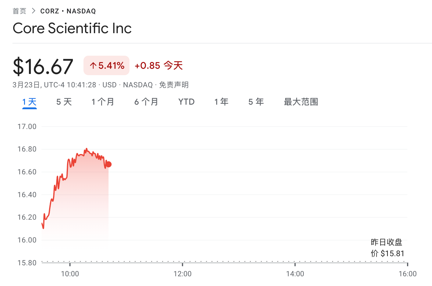 보도 시점 현재 CORZ는 미국 증시에서 안정적인 흐름을 보였습니다. 개장 후 약 5% 상승하여 주가는 한때 16.60달러를 기록했고, 시총 약 52억 8천만 달러에 달했습니다.