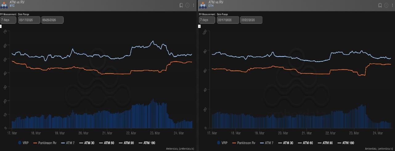 실제 변동성은 비트코인(BTC) 약 50, 이더리움(ETH) 약간 높은 약 60으로 비교적 안정적인 수준을 유지하고 있습니다. 내재 변동성은 여전히 실제 변동성보다 높아 캐리 트레이드 수익이 양수를 유지하고 있지만, 스프레드는 점차 좁아지고 있습니다.