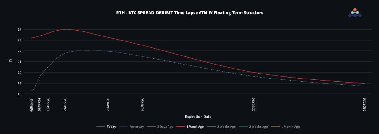이더리움(ETH) 과 비트코인(BTC) 간의 변동성 스프레드가 좁아지면서 이더리움의 강세는 구조적인 요인보다는 거래량 증가에 기인했다는 주장이 더욱 강화되었습니다.