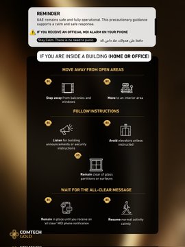 경각심과 단결이 필요한 이 순간, 명확성이 그 어느 때보다 중요합니다. ComTech Gold는 침착함, 책임감, 그리고 정보에 입각한 행동을 장려하는 데 있어 커뮤니티와 함께합니다. UAE는 안전하고 정상적으로 운영되고 있으며, 침착함을 유지하고 공식 지침을 따르며 검증된 정보에만 의존하는 것이 중요합니다. 실내든 실외든, 간단한 예방 조치만으로도 큰 차이를 만들 수 있습니다. 안전한 장소로 이동하고, 개방된 장소를 피하며, 항상 공식 채널을 통해 최신 정보를 확인하십시오. 함께 힘을 모아 경각심을 갖고, 준비하고, 회복력을 발휘합시다.