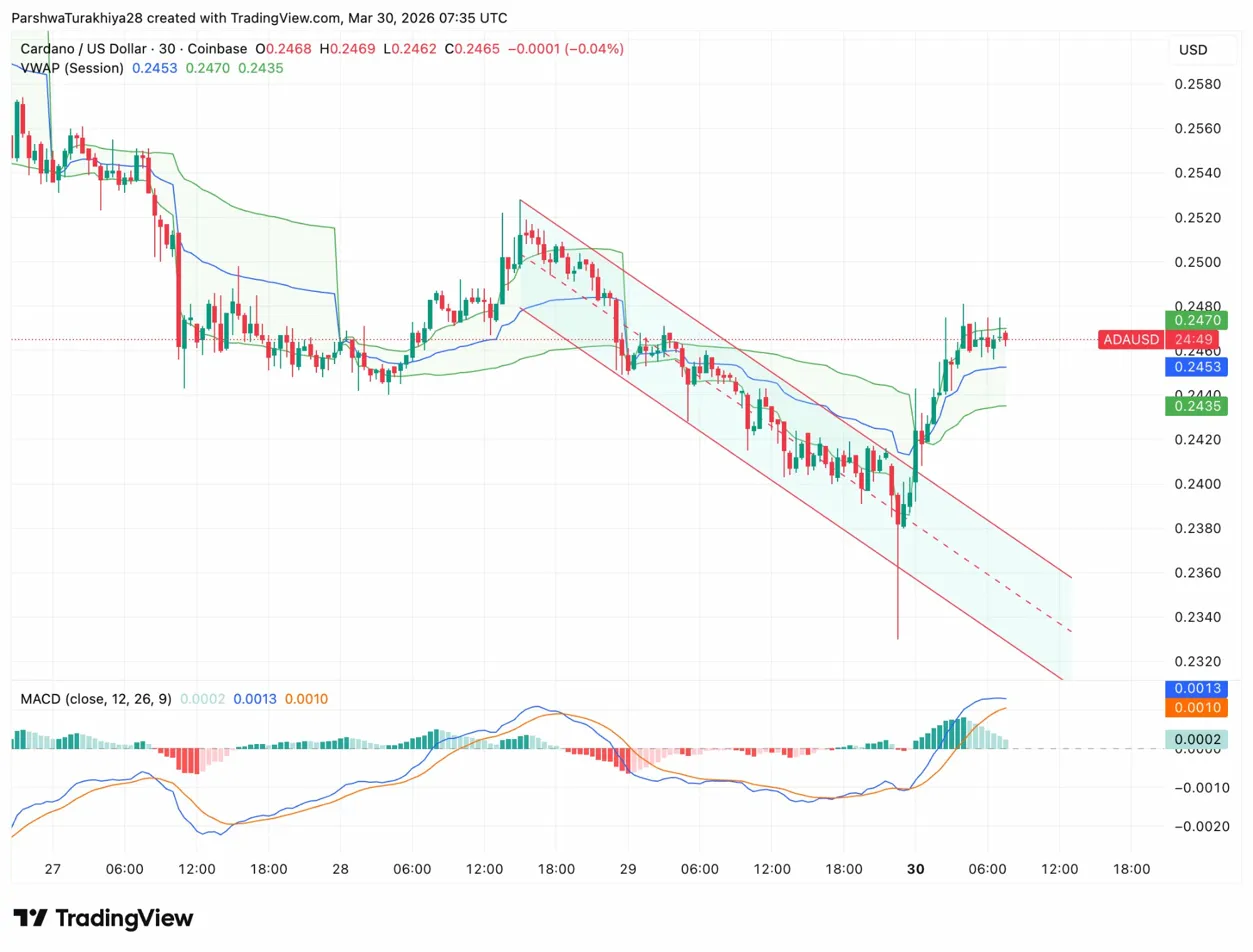 30분 차트는 3월 29일부터 30일까지의 전체 움직임을 포착했습니다. 에이다(ADA) 이틀 동안 명확한 하락 채널 내에서 움직이며 0.2520달러에서 0.2330달러까지 하락한 후 3월 30일 새벽에 채널을 급격하게 돌파했습니다. 이후 가격은 0.2465달러까지 회복했으며, 0.2435달러, 0.2453달러, 0.2470달러의 세 가지 VWAP 레벨 모두 위에서 거래되고 있습니다.